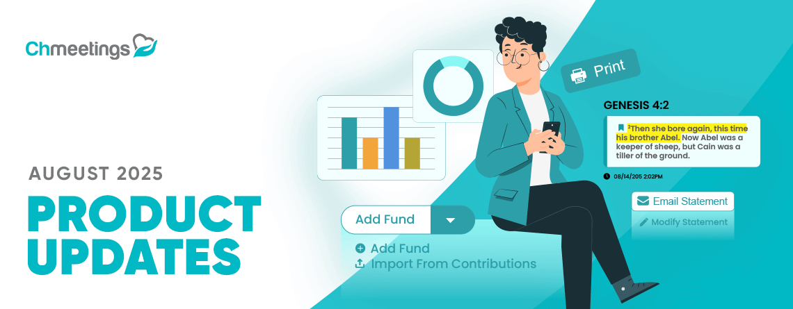 At ChMeetings, we work on making church management simpler, smarter, and more personal. This month, we’re introducing new tools across Accounting, Contributions, Bible engagement, Advanced Search, and the Branded App. We made these improvements to save you time, strengthen financial oversight, as well as enrich the way your members connect with Scripture and your church content. Let’s take a look at what’s new for August 2025.